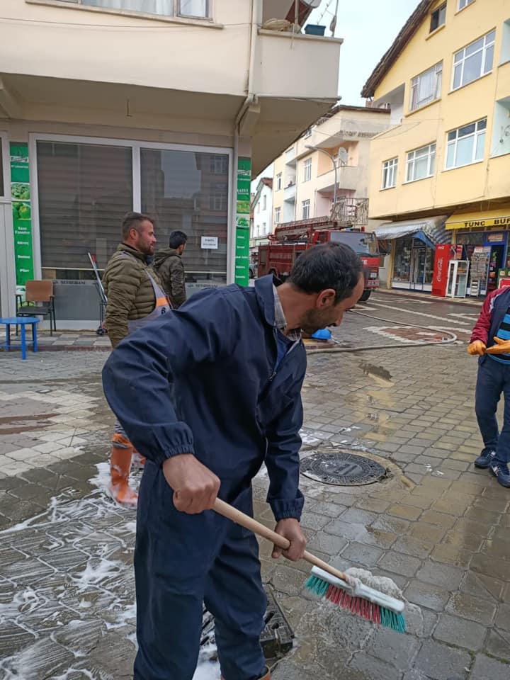 İlçe Merkezimizde,Cadde ve kaldırımların köpüklü ve tazyikli suyla yıkanmasından, toplu kullanım alanlarının dezenfekte edilmesine kadar hassasiyetle önlemlerimizi alıyoruz.